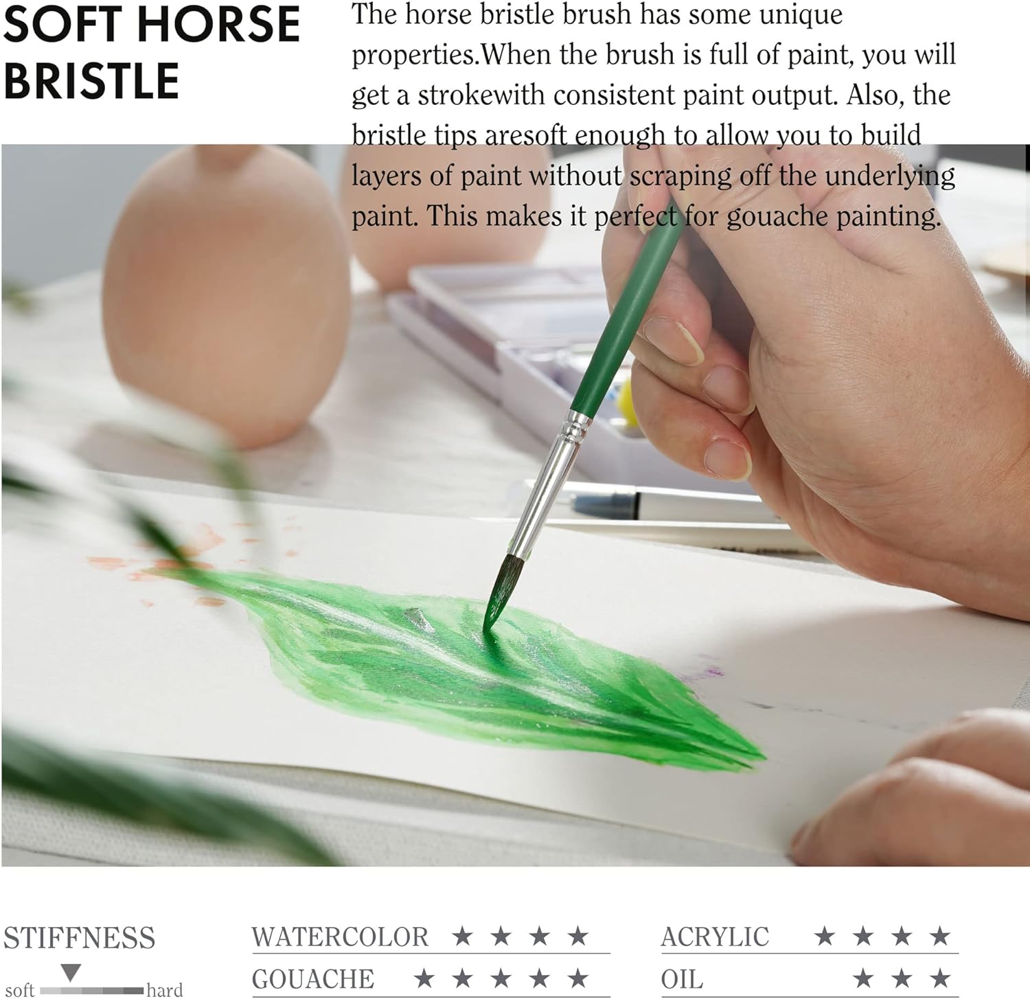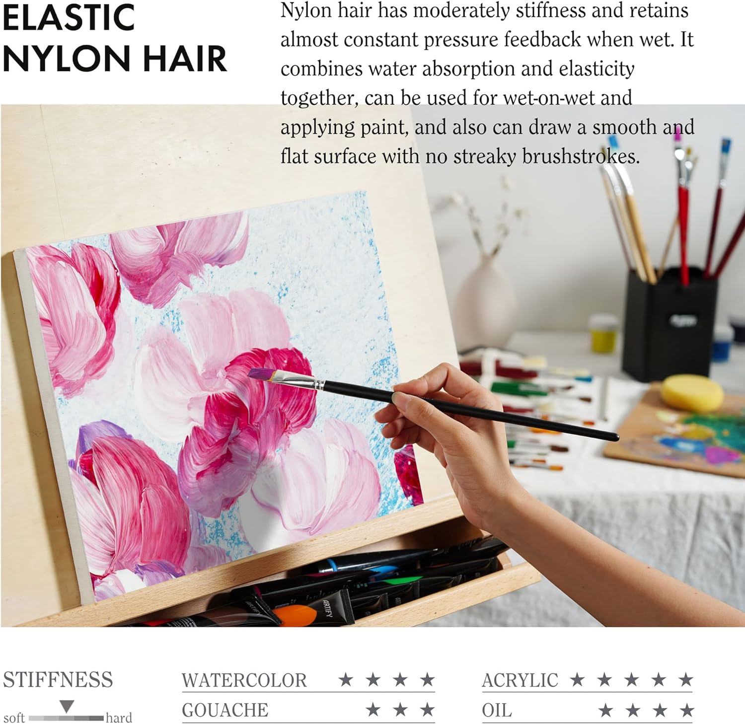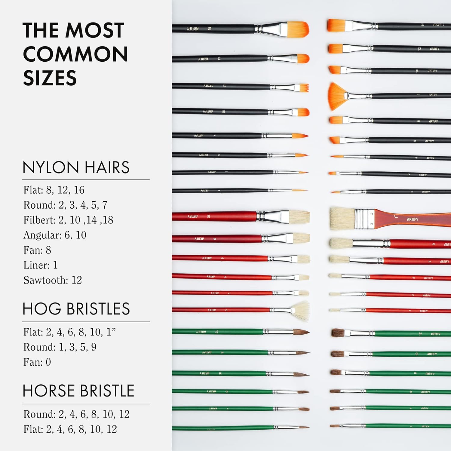 - Premium Paint Brushes: Unlike cheap bulk brushes, this set offers premium quality brushes. Each brush set contains 17 advanced nylon brushes, 12 artist hog bristle brushes and 12 horse hair brushes, all in a full Range of Sizes and Shapes. Included in the set are 8 different shapes: Flat, Flat Wash, Round, Filbert, Fan, Sawtooth, Angular and Liner