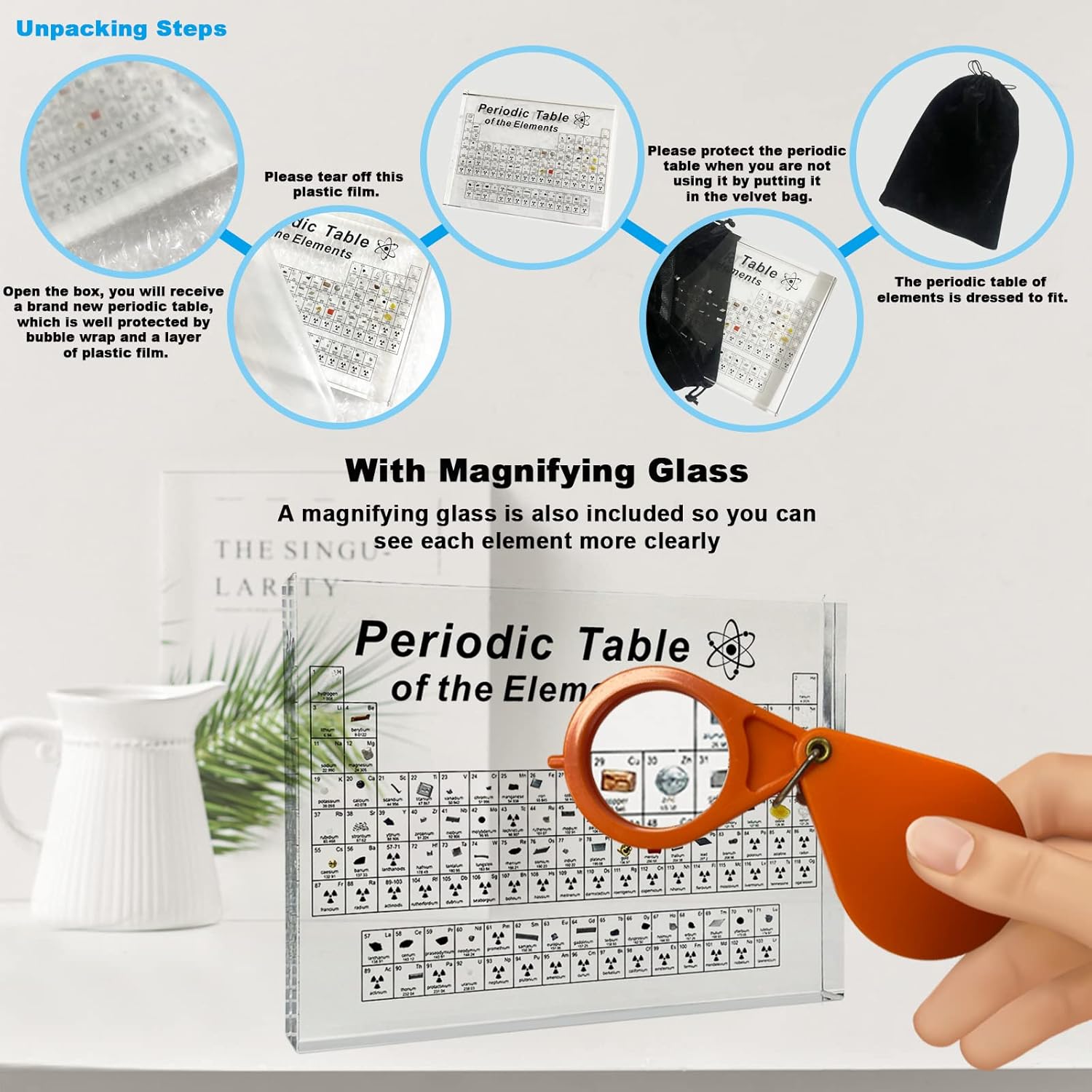 - 【Nice Gifts & High-Grade Decoration】This periodic table with real elements inside is not only for kids, but also a great science gift for adults, science fans and chemistry lovers. Parents can study and observe the periodic table of elements with their children to enhance relationship. It is also a nice decoration for office, school and home. This is definitely a high-class and beautiful tabletop ornament.