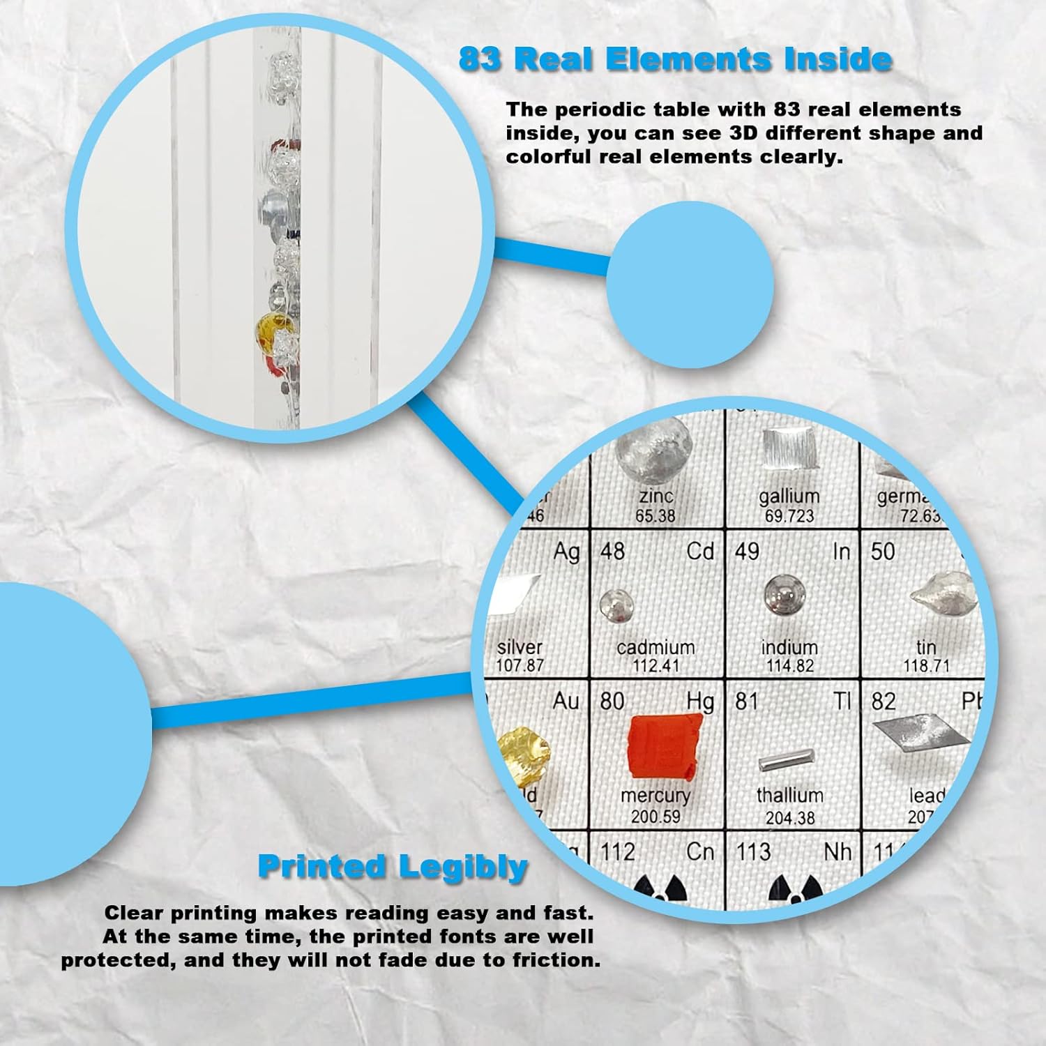 - 【83 Real Elements Inside】The periodic table with 83 real elements inside, you can see 3D different shape and colorful real elements clearly. Due to the instability, some elements easily react with each other and easily volatile, we give them a special treatment for safety. And some rare chemical elements have been specially replaced for which are not easy to collect.