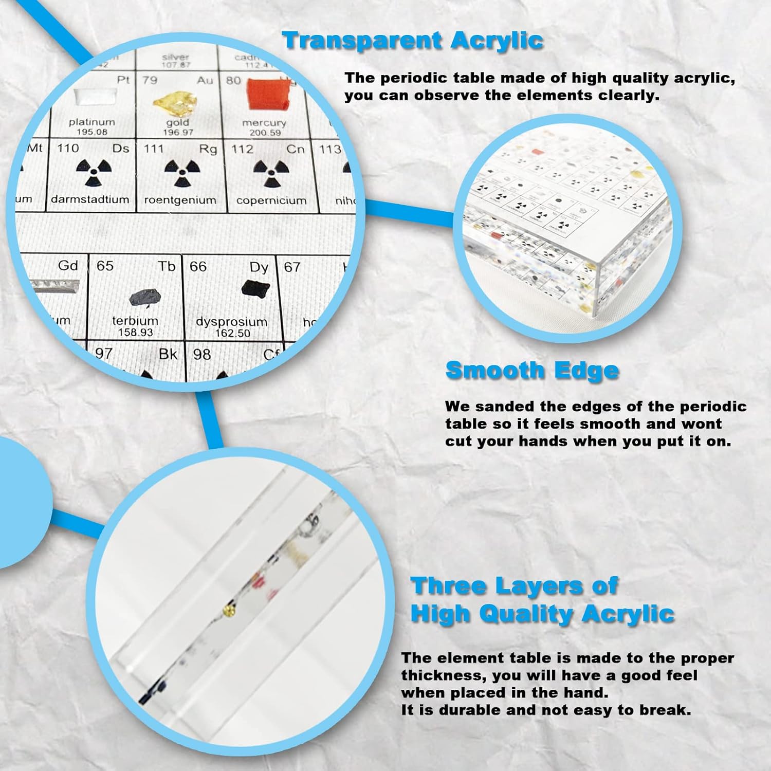 - 【Clear & High Quality】The periodic table made of three layers of high quality acrylic and printed legibly, you can observe the elements clearly. It is durable and not easy to break. We sanded the edges of the periodic table so it feels smooth and wont cut your hands when you put it on.