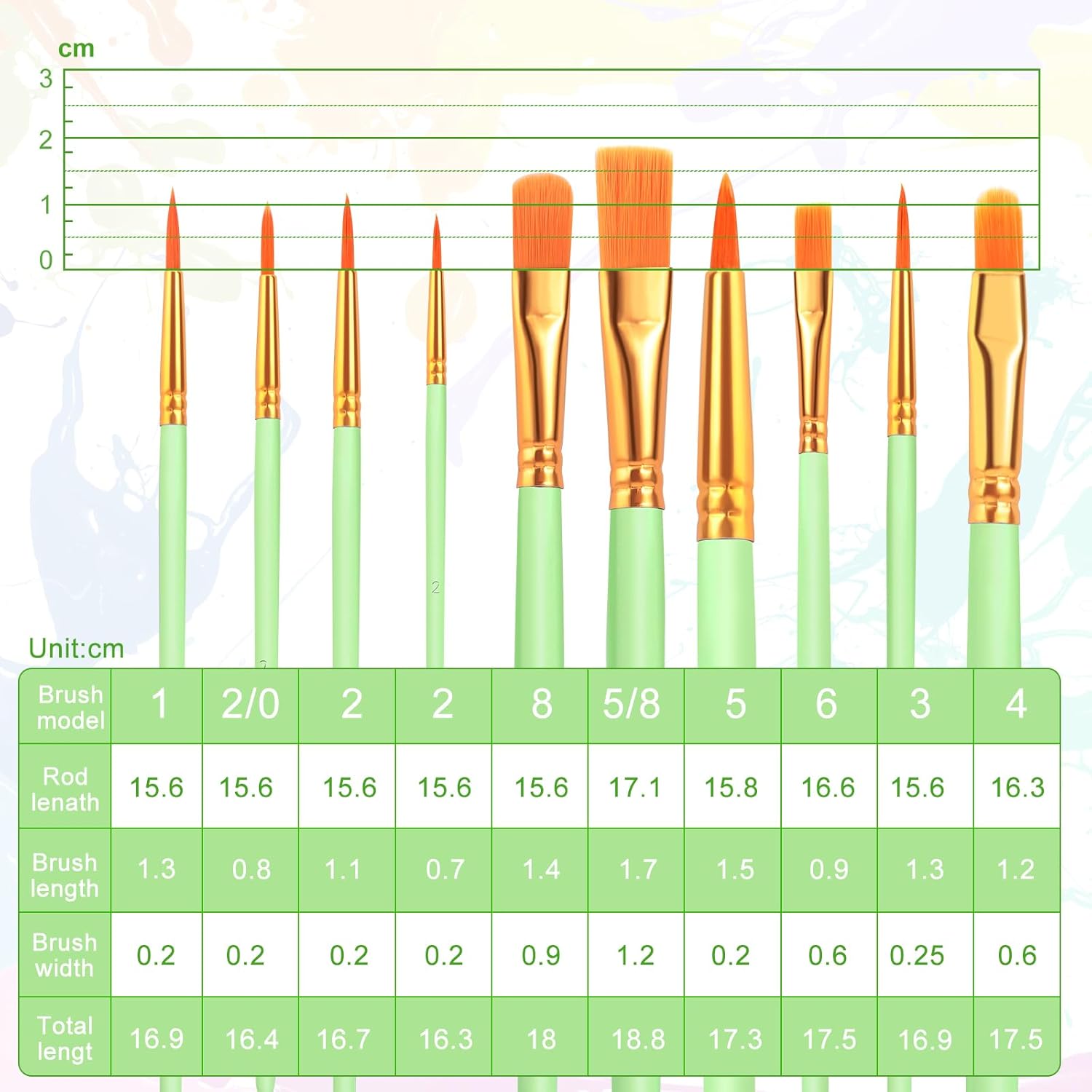 - 【10 Sizes of Paint Brushes】:Multi-functional Acrylic paint brush have various shapes,sharp flat angle shape, from coarse strokes to fine details, easy to use color multi-functional acrylic artist paint brushes,Suitable for students, teenagers, children and painters at all levels, a good painting brush supplies for friends and family who like painting!