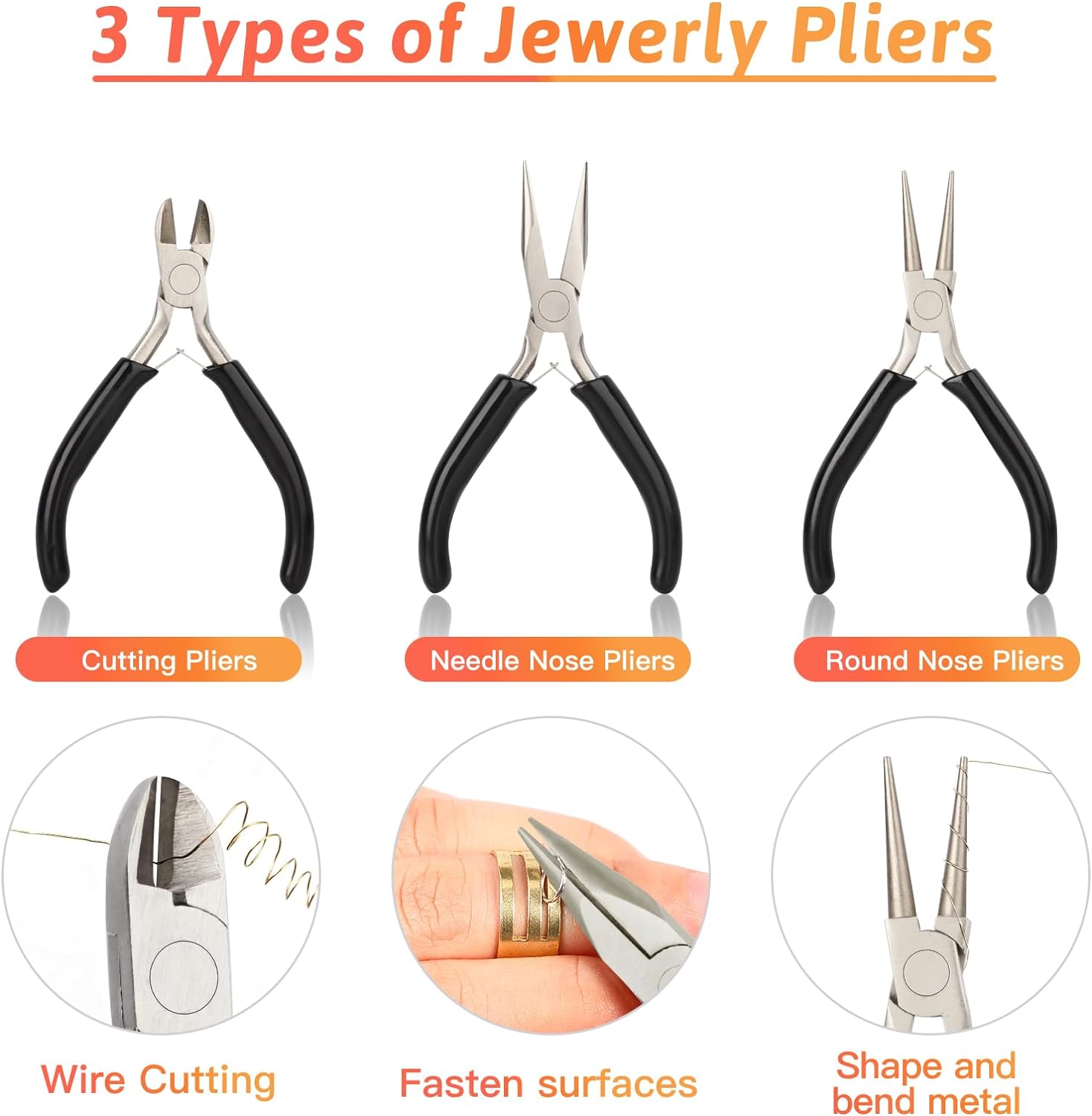 - ✅【3 Helpful Jewelry Pliers】In these jewelry making supplies, you will find 3 very helpful jewelry pliers:1 cutting pliers to cut wires; 1 needle nose pliers to fasten surfaces; 1 round nose pliers to make loops, shape and bend metal.