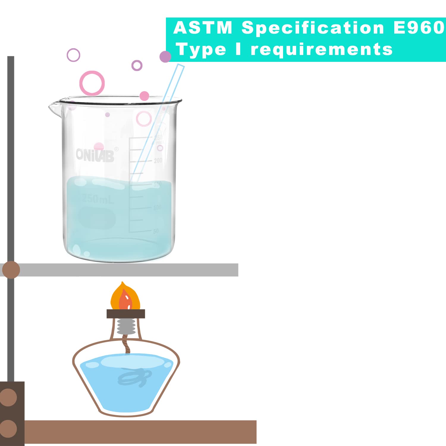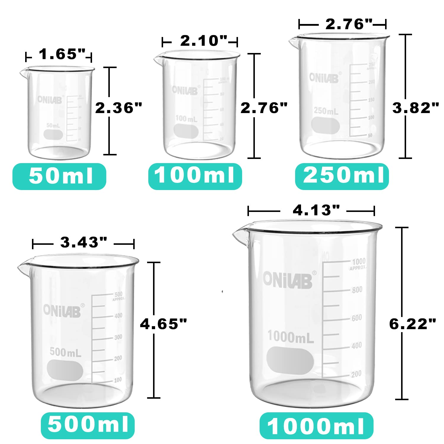 ONiLAB Glass Measuring Beaker Set 50ml 100ml 250ml 500ml 1000ml(Pack of 5) 3.3 Boro Griffin Low Form with Printed Graduation Scientific Glassware for Laboratories, Classrooms or Home Use