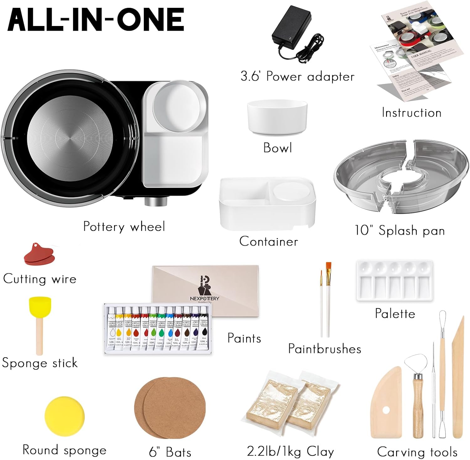 - đăAll-In-One KităThis pottery wheel kit for beginners and adults is fully equipped with 2.2lb of air-dry clay, a comprehensive set of 5 carving tools, a cutting wire, and a sponge. The package includes a detachable water basin and an detailed instruction, providing everything you need for a seamless start to your pottery journey.Â