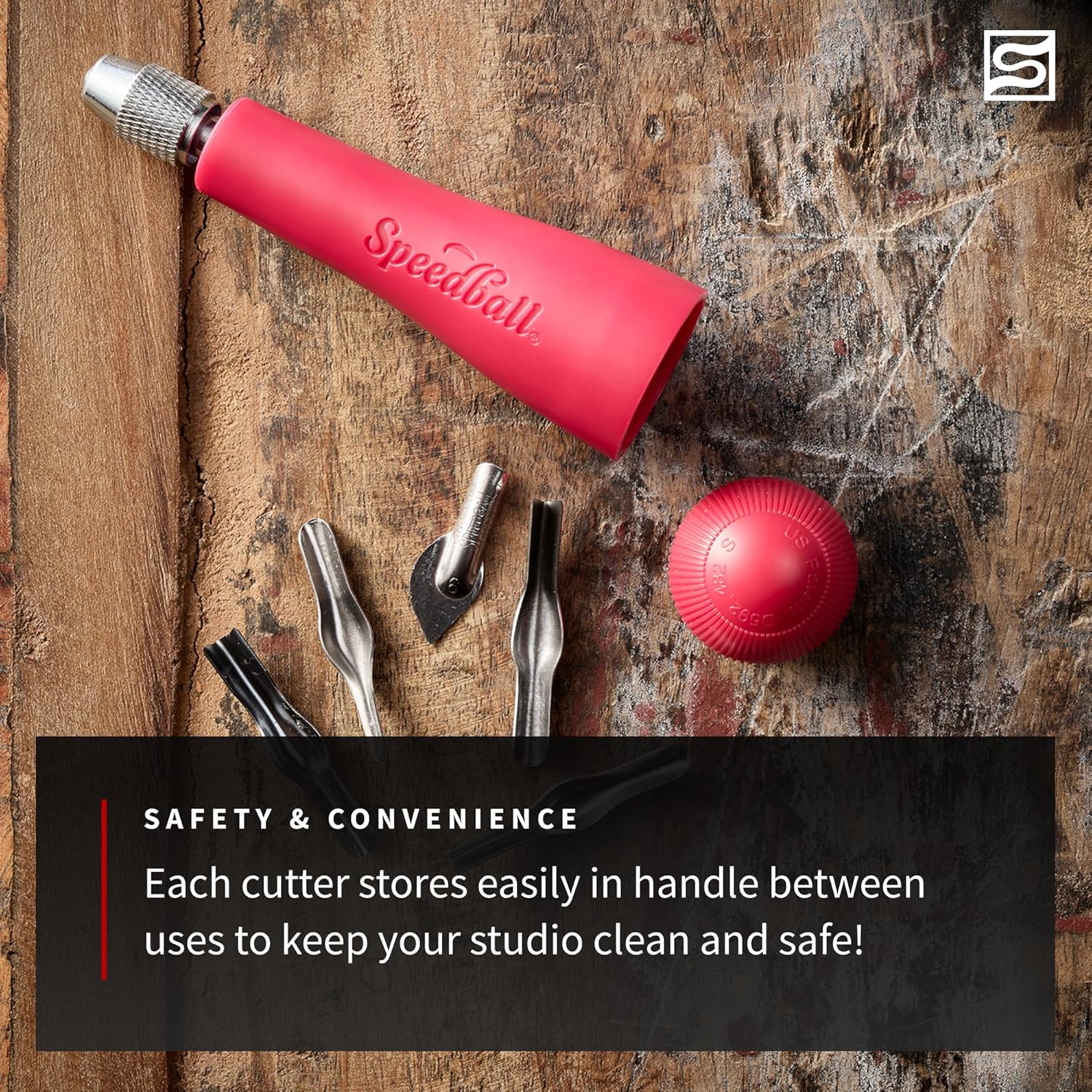 - COMFORT GRIP HANDLE – The lino handle is made from hard plastic with a hand-adjustable metal chuck making it easy to install and change cutters. The end of the handle twists off for convenient storage of cutters.