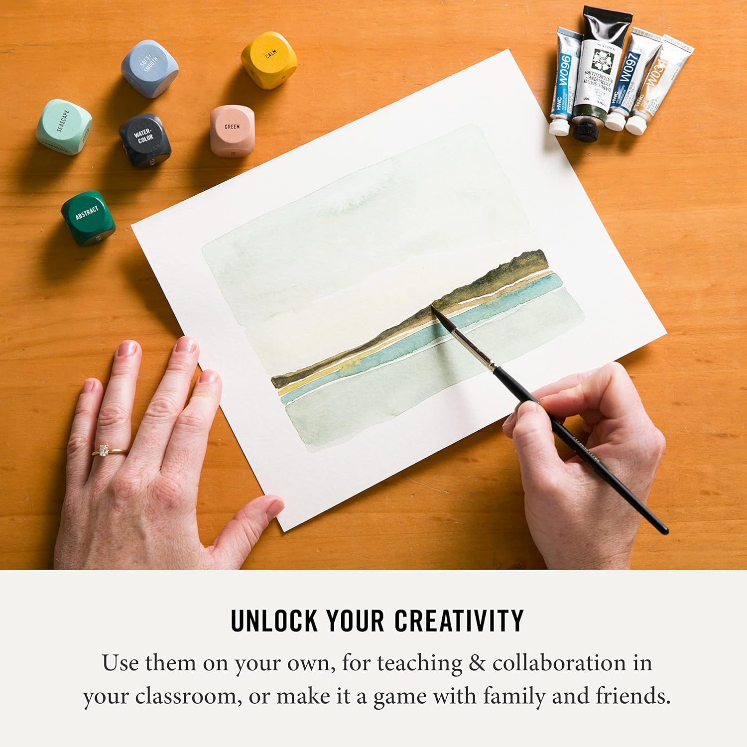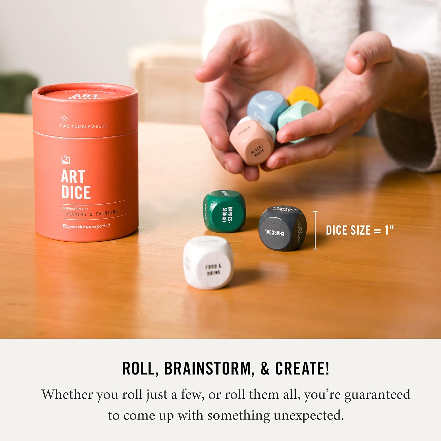 - THE FIRST & ORIGINAL ART DICE! Includes: 9 color-coded wood dice (1 inch with easy to read text). Just roll, brainstorm, & create! Endless drawing prompts to inspire your creativity