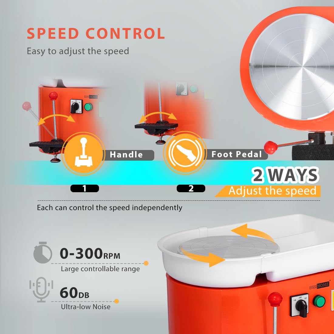 - ADJUSTABLE SPEEDS - Equipped with an independent foot pedal and a handle to adjust the rotation speed; While working with your pottery use the foot pedal to control the speed of the rotation without removing your hands; The handle is perfect for starting and finishing the work